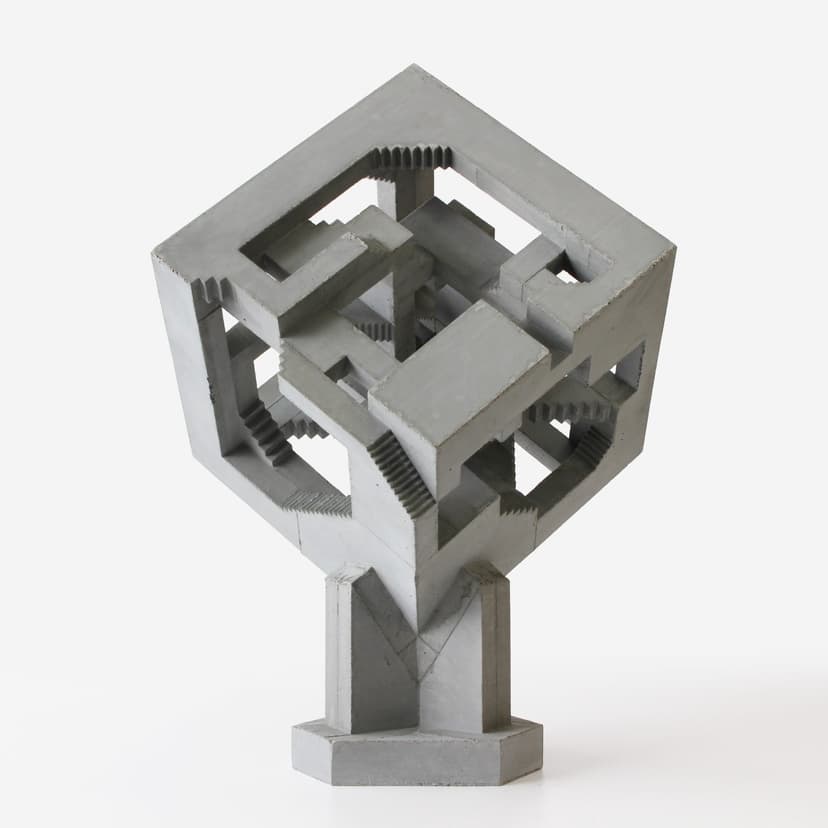 He concrete works of David Umemoto stand as studies about volume. At the juncture of sculpture and architecture, these miniature pieces evoke temporary buildings or monuments standing on far-away lands. The images conveyed in the mind by these works are numerous. They refer to the archaic and the ephemeral, despite the solidity and the modernity of the medium. Appearing before our eyes are pre- Columbian rock dwellings, god statues from the Andes or Easter Island, steles deteriorated by rain, remnants of modern cities having survived a cataclysm, fragments of Babylonian cities, colonial settlements brought down to their foundations, cenotaphs abandoned in the jungle…
